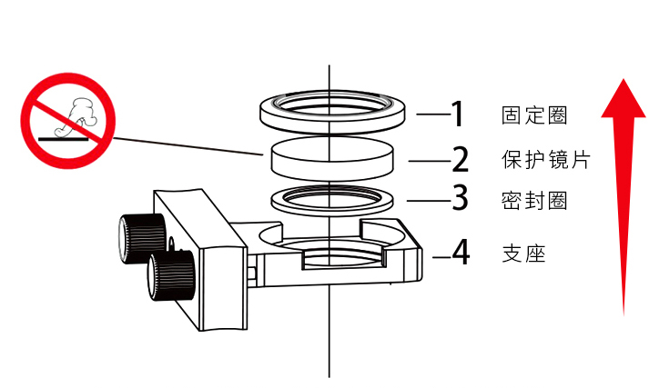2、放入1固定圈,要注意檢查3密封圈是否在保護鏡片下面。