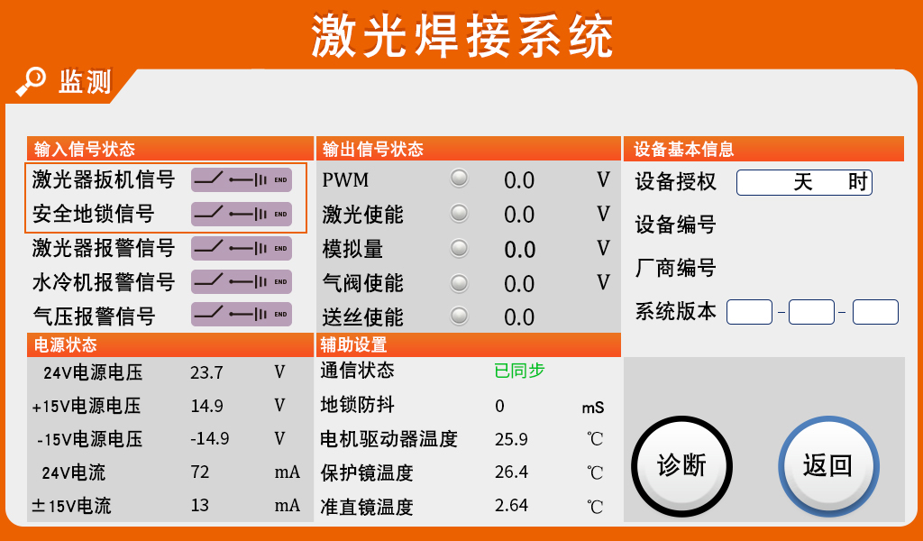 按照其運(yùn)行邏輯,只有【激光器扳機(jī)信號(hào)】和【安全地鎖信號(hào)】有效時(shí),才會(huì)出光(激光器狀態(tài)正常),同時(shí)首頁未出現(xiàn)任何報(bào)警