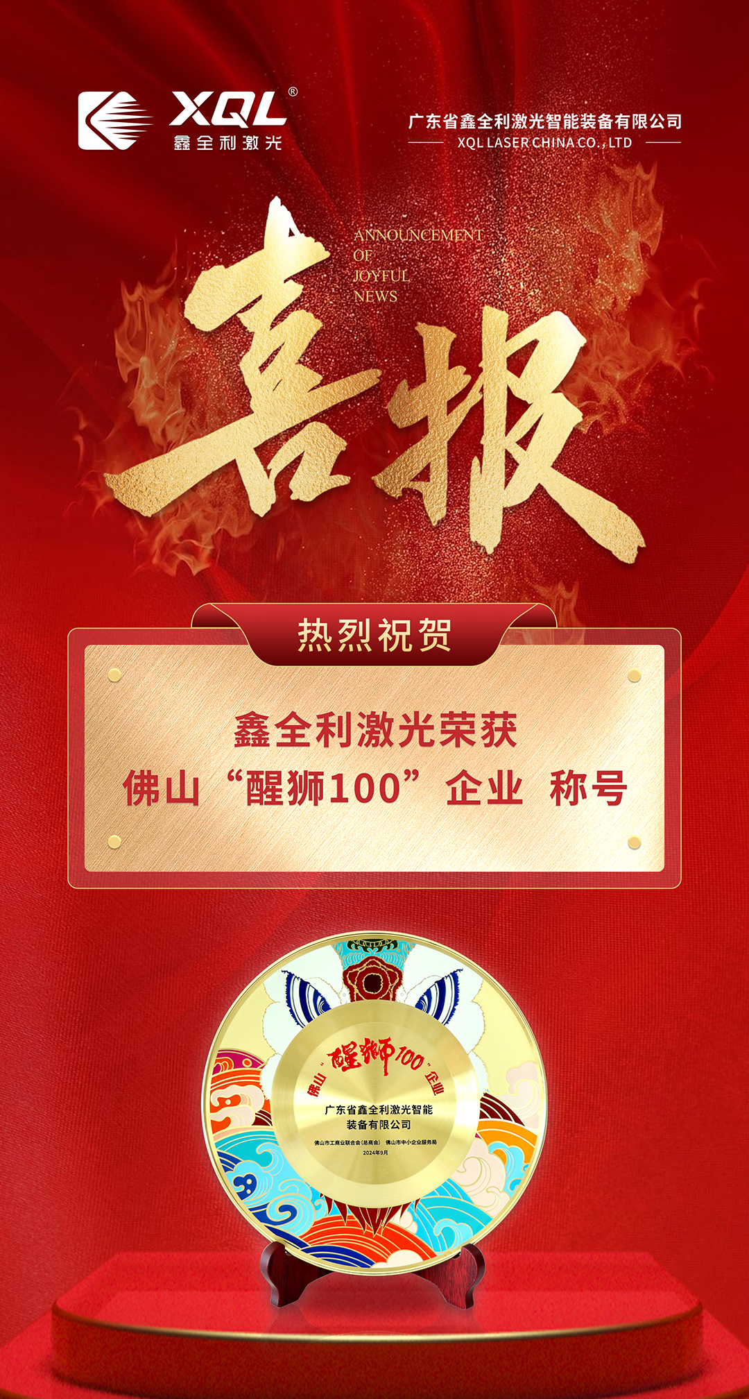 鑫全利激光榮獲佛山“醒獅100”企業(yè),為佛山發(fā)展新質(zhì)生產(chǎn)力貢獻力量!