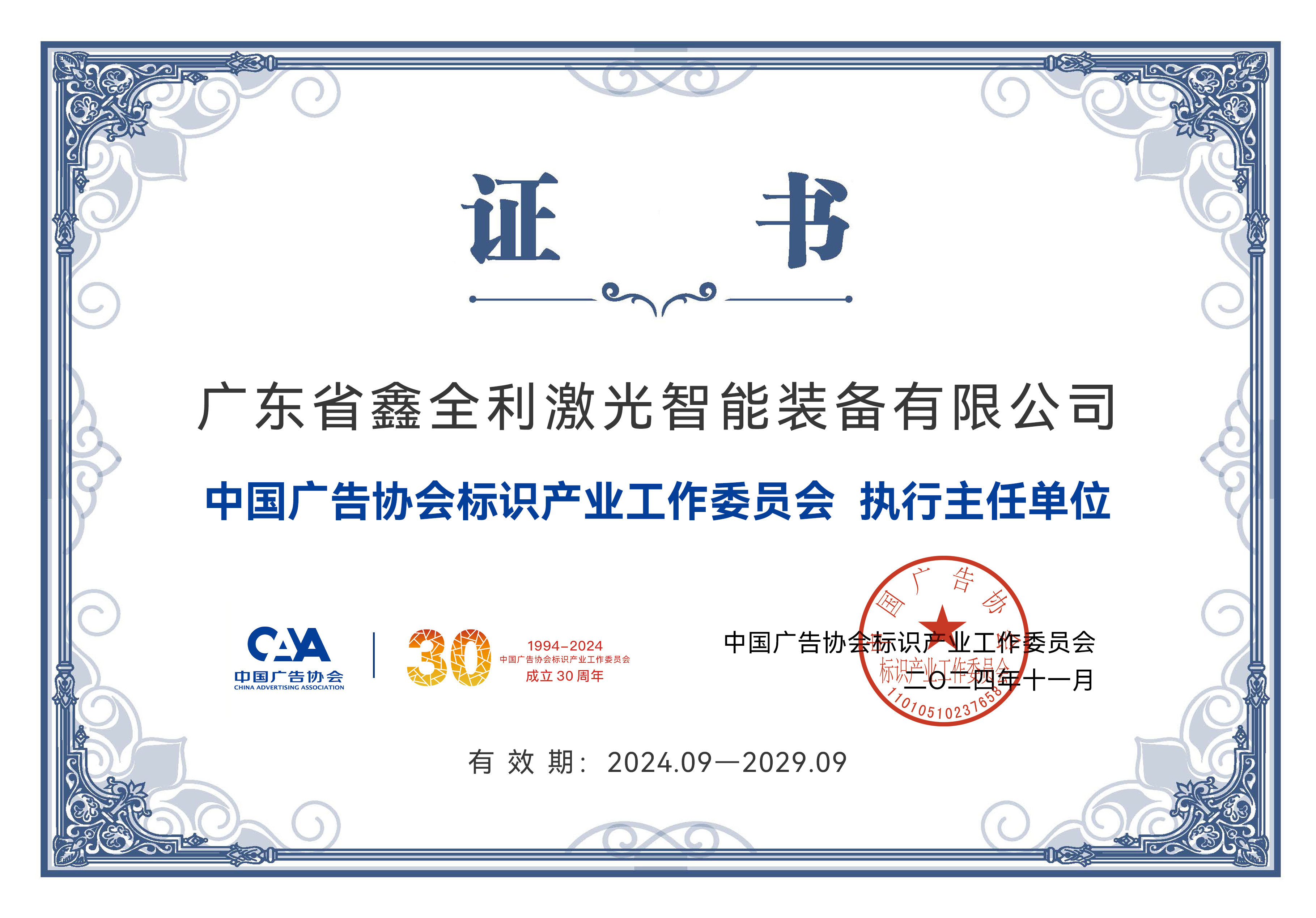 榮耀丨鑫全利激光當(dāng)選中國廣告協(xié)會(huì)標(biāo)識(shí)產(chǎn)業(yè)工作委員會(huì)執(zhí)行主任單位!