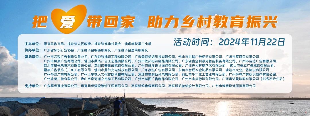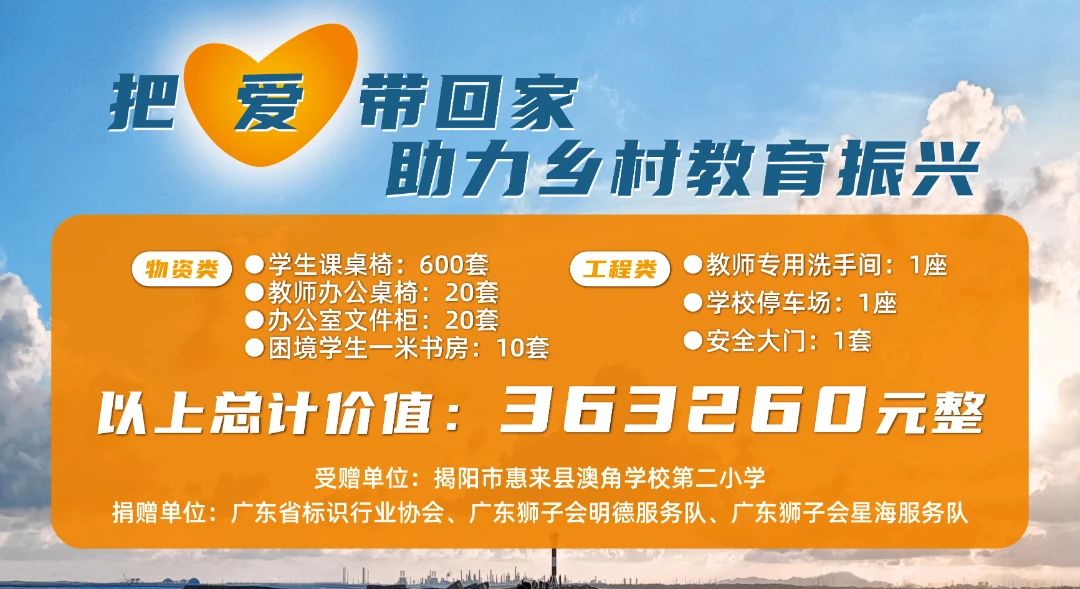 2024年11月22日,一場充滿愛心與溫暖的捐贈活動在澳角學(xué)校第二小學(xué)如期舉行。惠來縣教育局、神泉鎮(zhèn)人民政府、神泉鎮(zhèn)澳角村委會以及澳角學(xué)校第二小學(xué)聯(lián)合主辦了這次“把愛帶回家,助力鄉(xiāng)村教育振興”的活動,本次活動由廣東省標(biāo)識行業(yè)協(xié)會攜手獅子會明德&星海隊開展慈善捐贈活動。我司作為協(xié)會的理事單位,一直積極參與和支持廣標(biāo)協(xié)的各項活動,借助廣東省標(biāo)識行業(yè)協(xié)會搭建的平臺,發(fā)揮自身優(yōu)勢,助力鄉(xiāng)村教育振興!