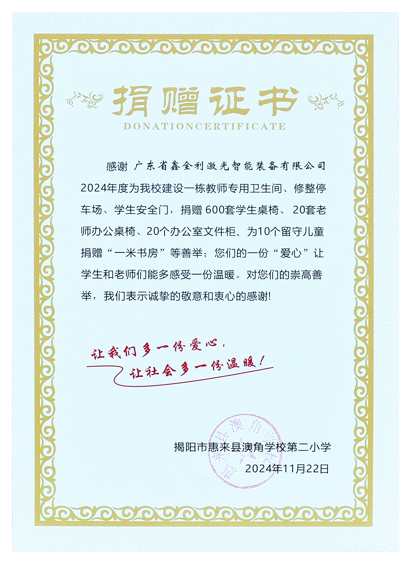 我們深信,鑫全利激光助力鄉(xiāng)村教育振興的涓涓細(xì)流,一定能吸引社會上更多的企業(yè)和個人參與到“百千萬工程”項目的洪流中,形成一股強(qiáng)大的社會合力,順利完成中共廣東省委關(guān)于實施“百縣千鎮(zhèn)萬村高質(zhì)量發(fā)展工程”,“一年開局起步、三年初見成效、五年顯著變化、十年根本改變的目標(biāo)”。