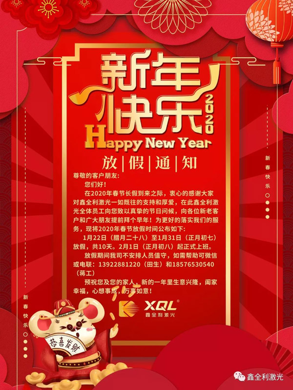 2020年1月22日(臘月二十八)至2020年1月31日(正月初七),2月1日(正月初八)起正式上班,給您帶來不便敬請諒解,感謝您的理解與支持!2020年春節(jié)將至,鑫全利激光全體員工祝您春節(jié)愉快、闔家歡樂、鼠年大吉大利!