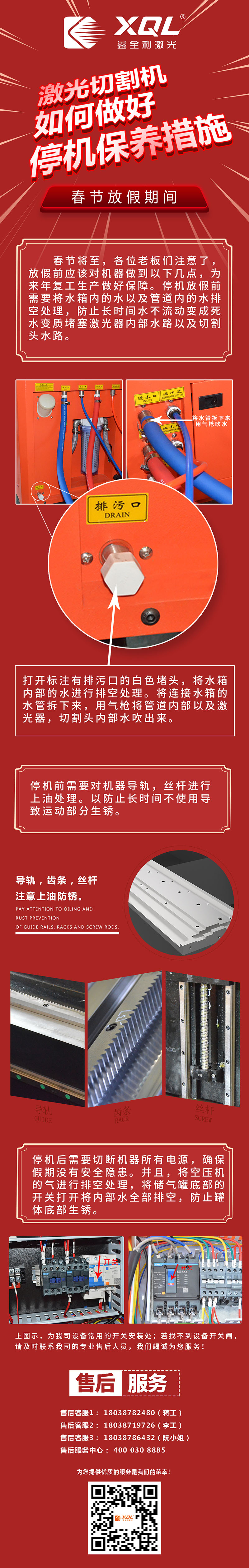 春節(jié)假期即將開啟,陪伴了大家一整年的激光設備,也將在節(jié)假日停機休息。但是,停機就是關掉設備那么簡單嗎?今天,鑫全利激光就來為大家科普一下激光切割設備年前關機注意事項,協(xié)助您做好春節(jié)停機的設備保護工作!