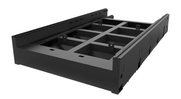 機加工時使用數(shù)控龍門銑床,一次性加工床身兩側(cè)的導軌和齒條安裝面,保證了機架兩側(cè)導軌、齒條安裝面精度的一致性。