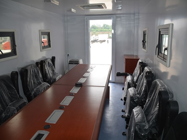 大型移動(dòng)指揮車一般會配置6部以上的無線電車載基臺,有些會多達(dá)10部以上,能夠協(xié)調(diào)眾多的單位。同時(shí)大型移動(dòng)指揮車還要安裝供車內(nèi)通話使用的通訊系統(tǒng),滿足指揮車內(nèi)部各個(gè)功能區(qū)的聯(lián)絡(luò)需要。 多數(shù)移動(dòng)指揮車還會安裝多部地面線路通訊交換機(jī)和無線通訊車載基站,既可以連接現(xiàn)有有線通信線路,也可以搭建臨時(shí)的無線通信網(wǎng)絡(luò),保證指揮部門多線路的通信需求。尤其是面對互聯(lián)網(wǎng)應(yīng)用的發(fā)展,移動(dòng)指揮車還要搭載移動(dòng)寬帶網(wǎng)絡(luò)服務(wù)設(shè)備。因此一臺大型移動(dòng)指揮車就是一臺應(yīng)急通信車。這在通信不暢的山區(qū)荒野和自然災(zāi)害現(xiàn)場,具有重要意義。通常的大型移動(dòng)指揮車都將指揮設(shè)置在車體后部,同時(shí)兼做會議室的功能,下圖就是面向車體后部的車內(nèi)視圖,對于一些外形尺寸受限的中型移動(dòng)指揮車而言,在通訊聯(lián)絡(luò)區(qū)域之后,一般是如下圖中間位置那樣設(shè)置一個(gè)建議的休息空間用作會議室,那些大型移動(dòng)車則要在類似的位置安裝更多新奇的裝備。